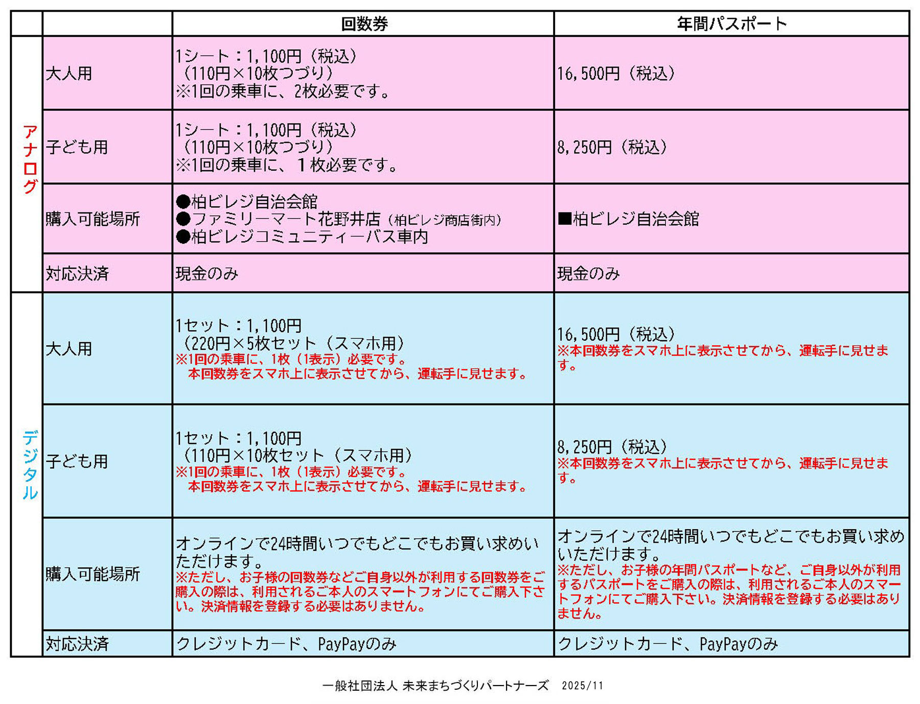 柏ビレジコミュニティバスを利用するためには、回数券か年間パスポート購入が必要になります。 車内での現金精算は出来ませんので、ご注意ください。 なお、本回数券の有効期限は2026年6月までの1年間です。